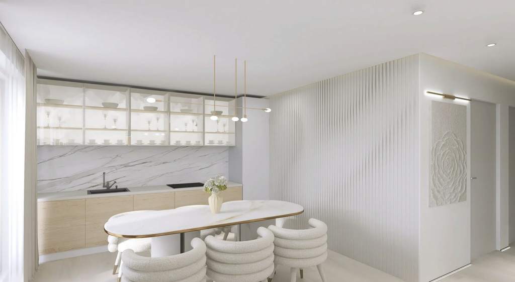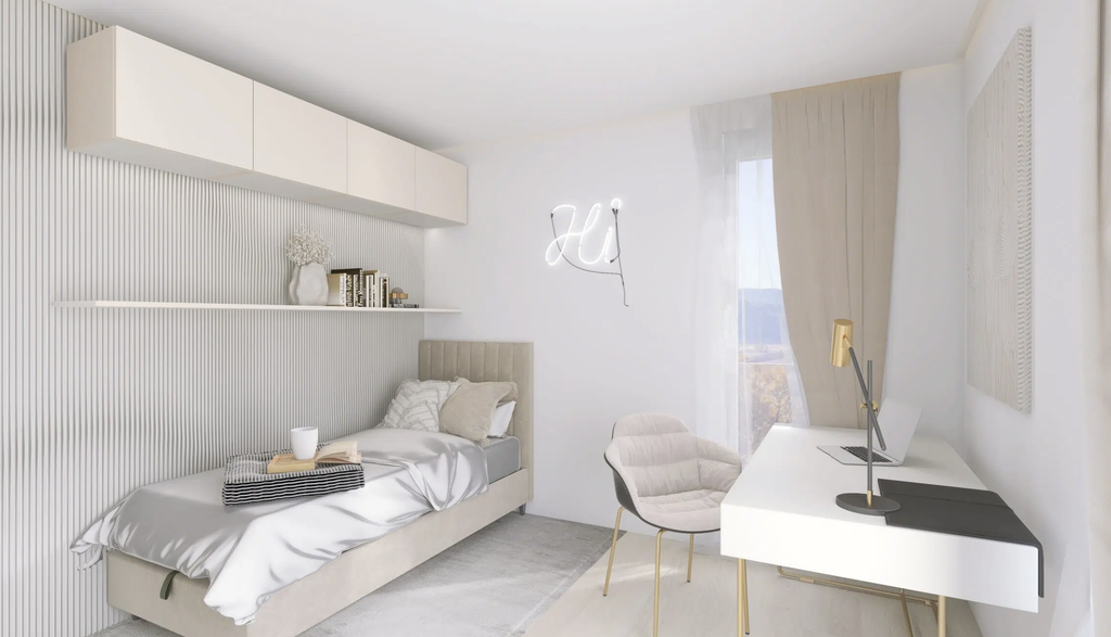 Funkcionalno zasnovano stanovanje omogoča stanovalcu udobno bivanje. V stanovanje vstopamo skozi predprostor v odprt dnevni del velikosti 27,6 m2. Skozi dnevno sobo in jedilnico lahko vstopamo na pokrito in nepokrito teraso. Nočni del pa predstavljata spalnica in otroška soba. Skupaj pa ju povezuje kopalnica v velikosti 6 m2.