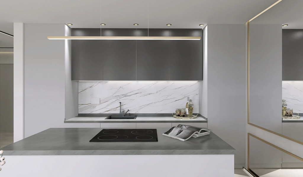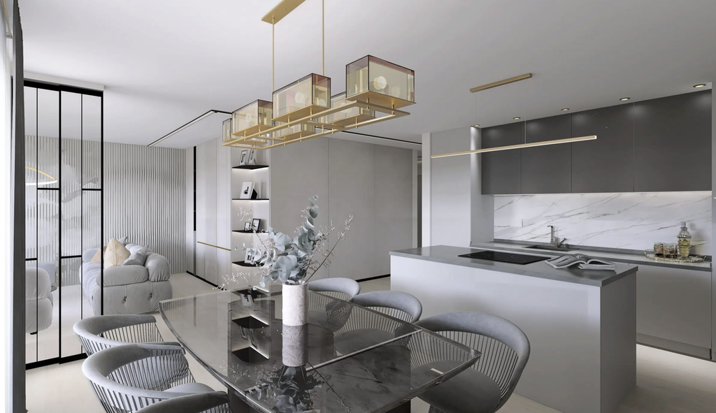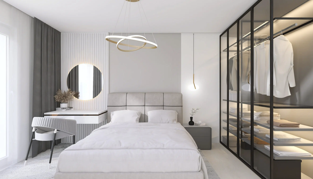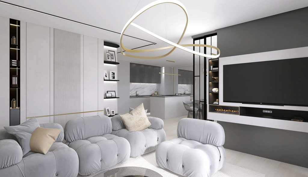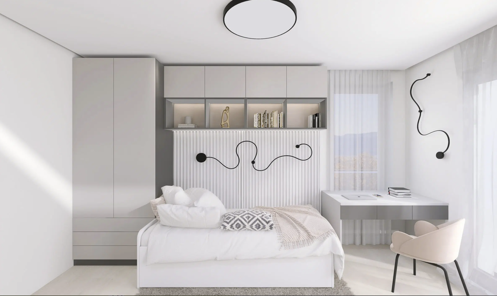 Funkcionalno zasnovano stanovanje omogoča stanovalcu udobno bivanje. V stanovanje vstopamo skozi povezovalni hodnik nočnega in dnevnega dela. Odprt, dnevni del v velikosti 44,4 m2 predstavlja kuhinjo z otokom, jedilnico in dnevno sobo z delovnim prostorom. Skozi dnevno sobo in jedilnico lahko vstopamo na pokrito in nepokrito teraso. Nočni del pa predstavljata spalnica in dve otroški sobi, ki omogočajo dostop do atrija (30 m2) . Skupaj pa ju povezuje kopalnica v velikosti 6 m2 in dnevni WC, kjer je puščeno za pralni in sušilni stroj.